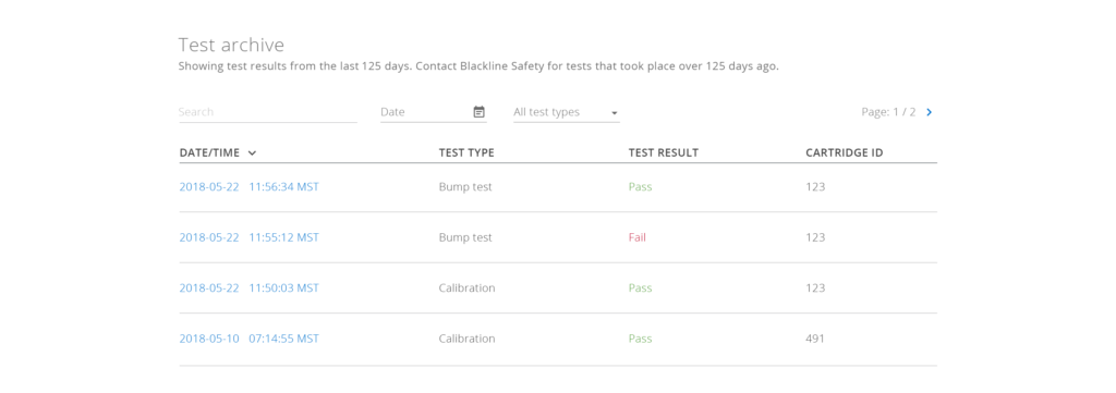 Once a device's activation code has been submitted and matched to a device, the certification list will appear. By default, it will show the device's most recent bump test and most recent calibration. The table for each test will list the date and time the test was done, the type of test, the result of the test and the unit ID of the cartridge used. Click on the date and time to open the certification details page and see more information about the test.