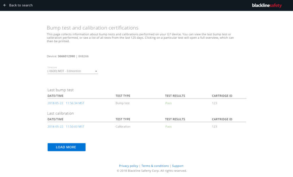 In addition to the most recent bump test and calibration, the user can also click the Load more button to bring up a third table. This table will retrieve and display all bump tests and calibrations performed within the last 200 days. Tests older than 200 days can still be retrieved by contacting Blackline Safety's Technical Support team.