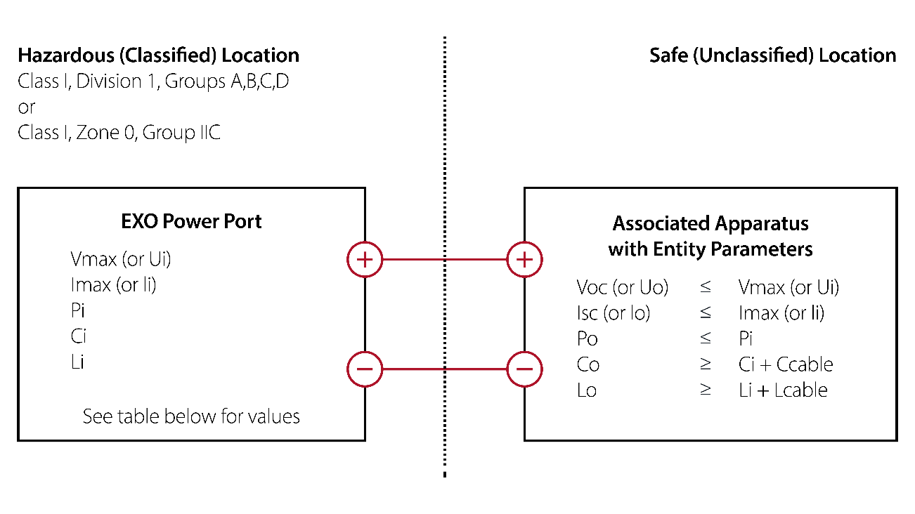 Install EXO power port accessories as shown in the following electrical diagram to ensure intrinsic safety.Figure 1. Power port parameters diagram